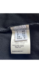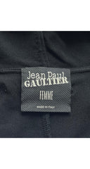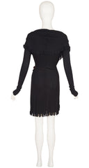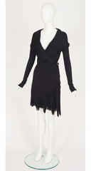 This 2000s Jean-Paul Gaultier Femme dress was made in Italy of unlined black viscose jersey. It has a large shawl collar that can worn as a hood, a handkerchief hemline in the front, and fringe trim throughout. The dress slips over the wearer's head and fastens in a wrap style with a patent leather buckle on the left side. It's in excellent condition, clean and ready to wear.