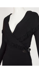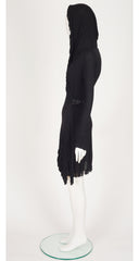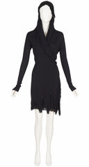 2000s Black Rayon Jersey Fringe Trim Hooded Wrap Dress