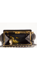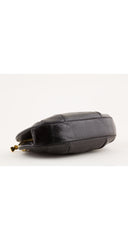 This 1980s Judith Leiber clutch was made from black reptile skin with multi-color cabochons at the top and a grosgrain lining. The bag opens by pulling the metal mechanism on the left side. The interior has two pockets, including one that zips closed. It comes with the original 3" x .75" gold-tone metal hair comb that was made in Italy. The bag measures 10" wide x 6" high x 3.5" deep. It was convertible but the original owner cut the straps. It's otherwise in very good condition.