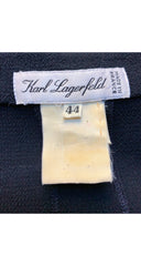 This double-breasted navy Karl Lagerfeld collared dress is from his 1989 S/S collection, and was featured in black on that season's runway. It was made in France of unlined wool crepe, with two front slit pockets, rolled-up cuffs and a drop waist. It fastens with fleur-de-lis buttons and has a faux breast pocket.