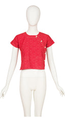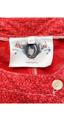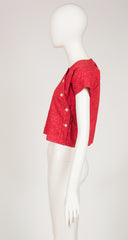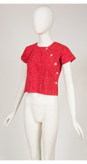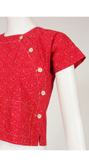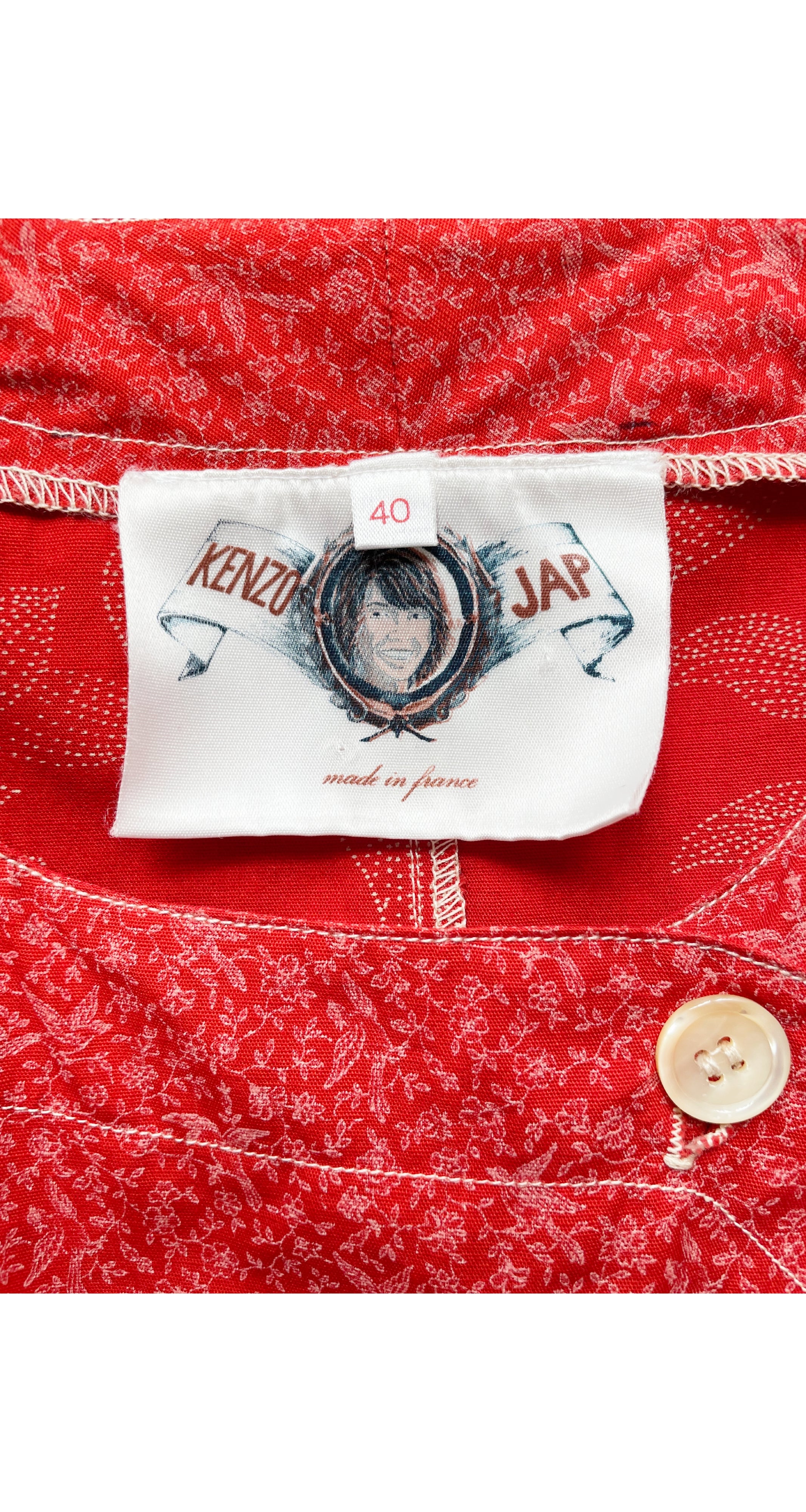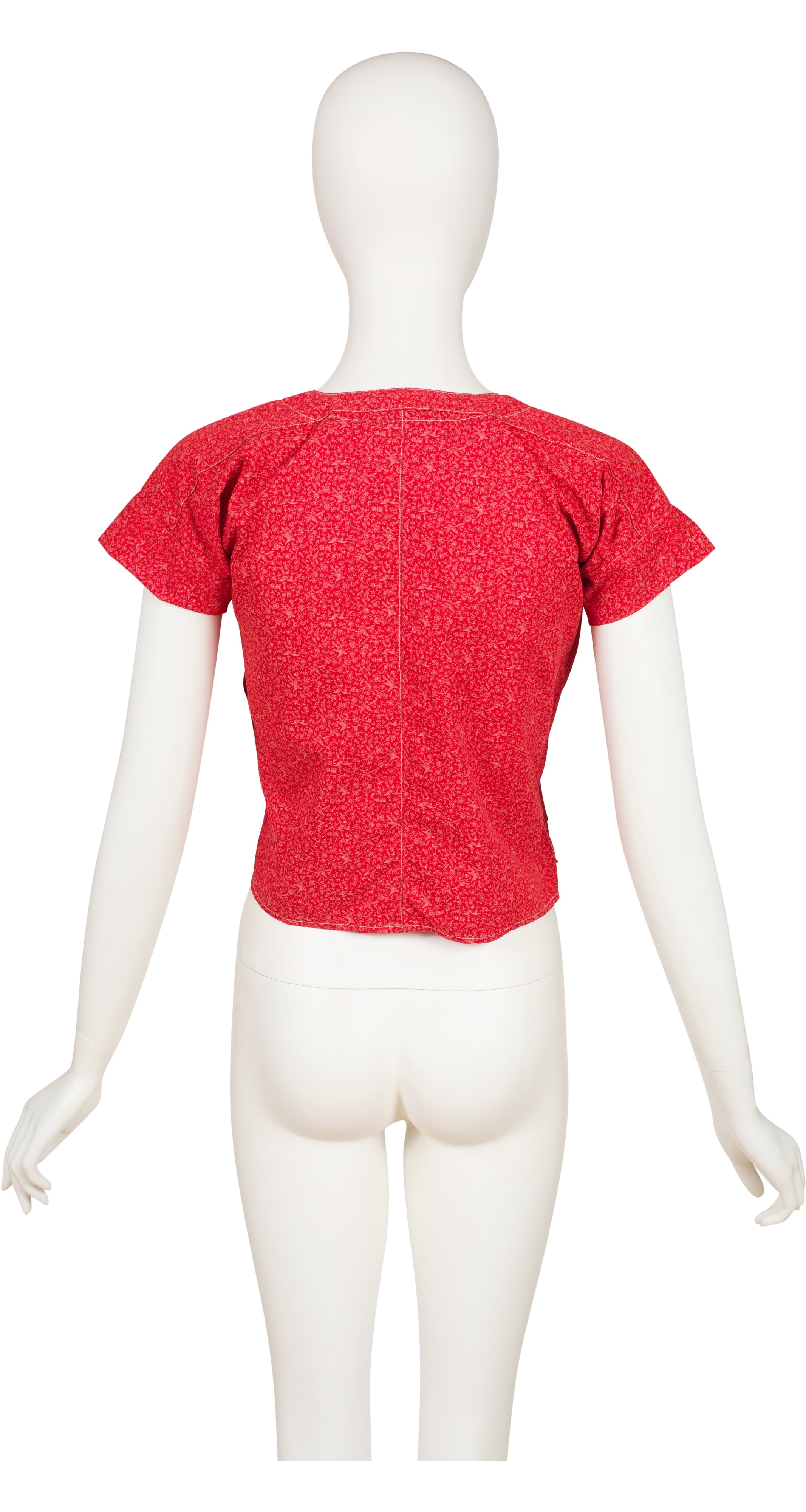 This 1975 S/S Kenzo Jap short sleeve crop top was made in France of red cotton with a small white floral and bird print. The black version was featured on the March 1975 cover of Elle France. It fastens up the front left side with five shell buttons. It's in excellent condition, clean and ready to wear.