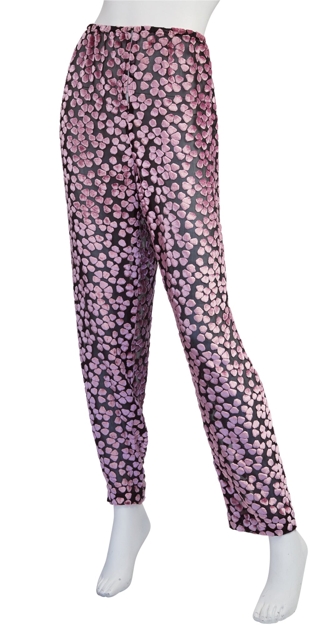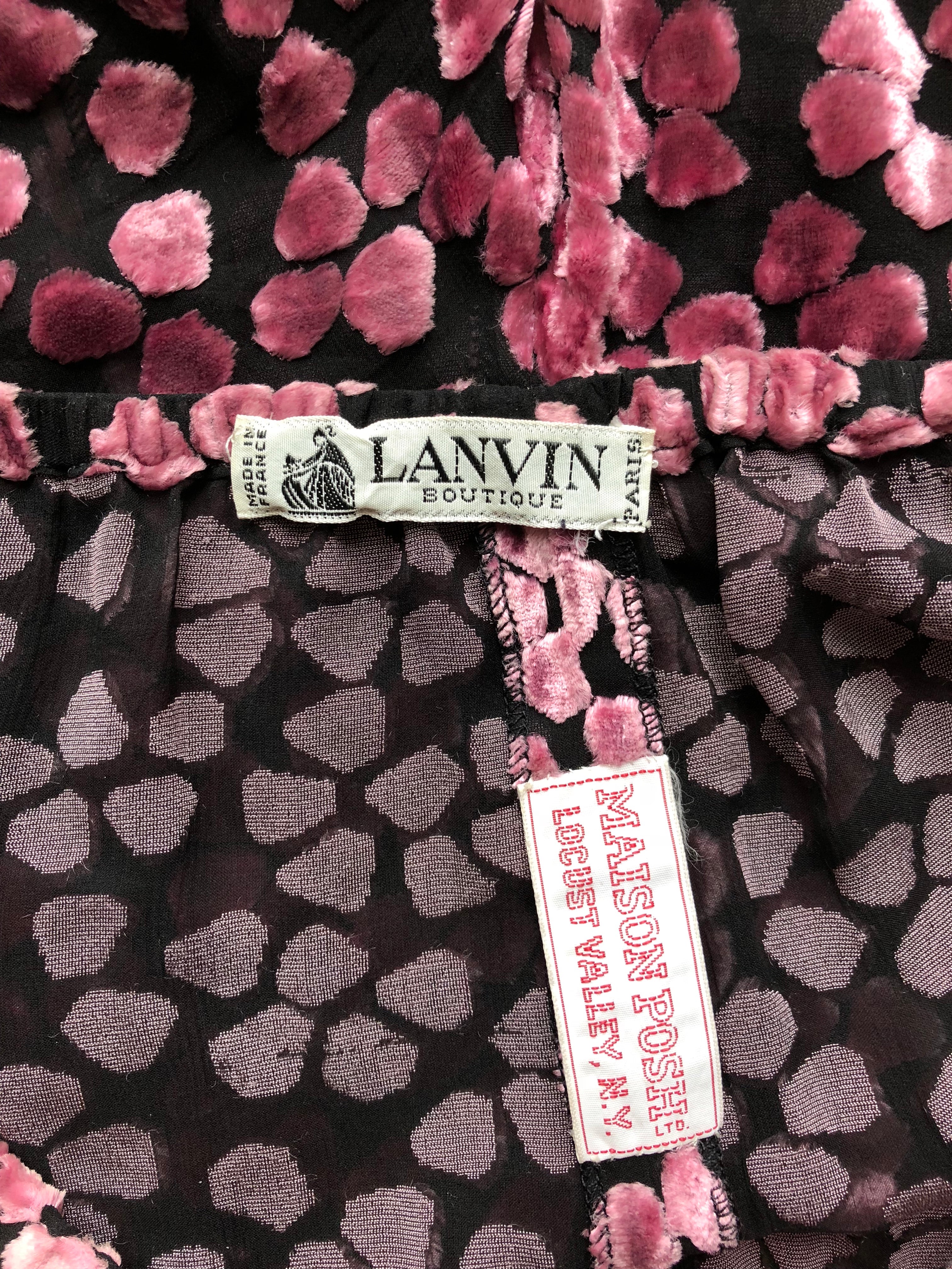 These Lanvin Boutique high-waisted pants were purchased at the upscale boutique “Maison Posh” in New York State circa 1978. Made in France from 100% silk devore in black and orchid, they are semi-sheer with no lining. They have an elastic waist and do up at the front of the waistband with a hook-and-eye. They are in excellent condition, clean, and ready to wear.