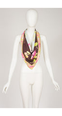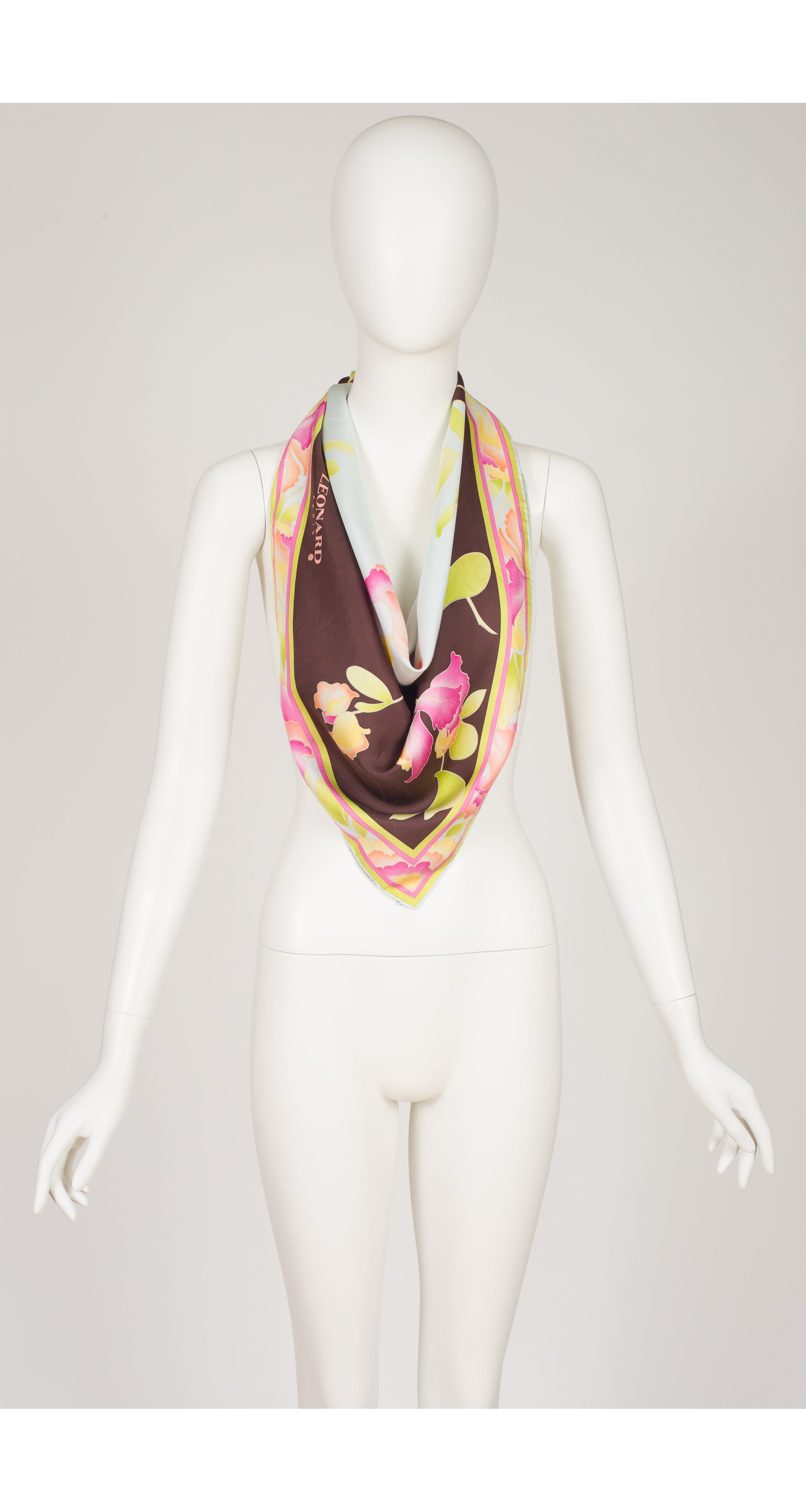 This 1990s Leonard Paris scarf is silk twill with hand-rolled edges, and a floral print in baby blue, brown, pink, yellow, and green. It measures 34.5" x 33.5". Overall, it's in good condition. The silk has lost some of its lustre from being washed; we have priced accordingly. It has been professionally dry-cleaned.