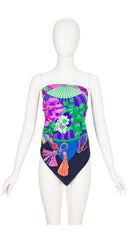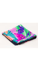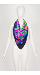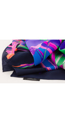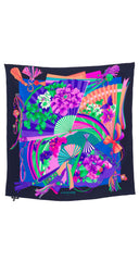 This 1990s Leonard Paris scarf was made in Italy of navy blue silk with a vibrant print featuring florals, tassels, and fans. It has hand-rolled edges and the "LEONARD - PARIS" signature at the bottom centre. It measures 34" x 33", and is in excellent condition, clean and ready to wear.