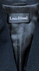 This 1980s Louis Féraud double-breasted collared coat was made from a black cashmere and wool blend. Lined in "Louis Féraud" signed rayon, it has a pocket on each side, built-in shoulders pads, and its original tie belt included. It does up with six logo buttons and has an additional button on the front of each shoulder. It's in excellent condition, has been professionally dry-cleaned and is ready to wear.