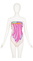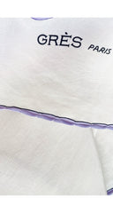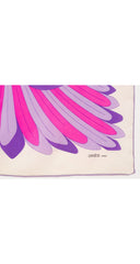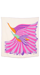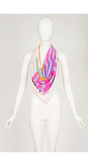This 1970s Madame Grès scarf is made from cream silk with a vibrant orange, purple, pink, and green stylized bird print. It's signed "GRES - PARIS" in the bottom right-hand corner, has hand-rolled edges, and measures 34" x 32". There is some light color transfer but it's very discreet and we would still consider the scarf to be in very good condition. It's been professionally dry-cleaned and is ready to wear.