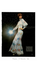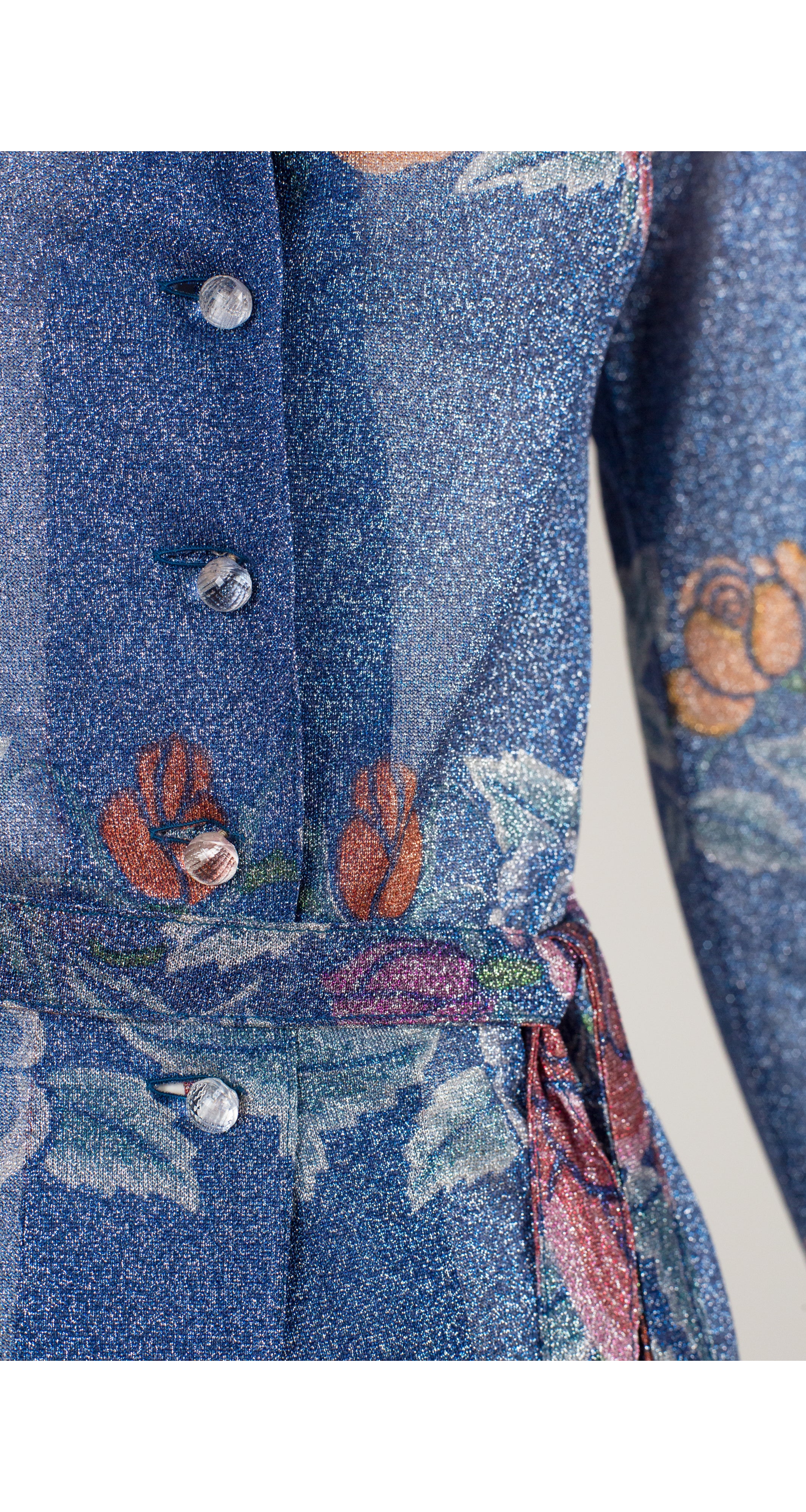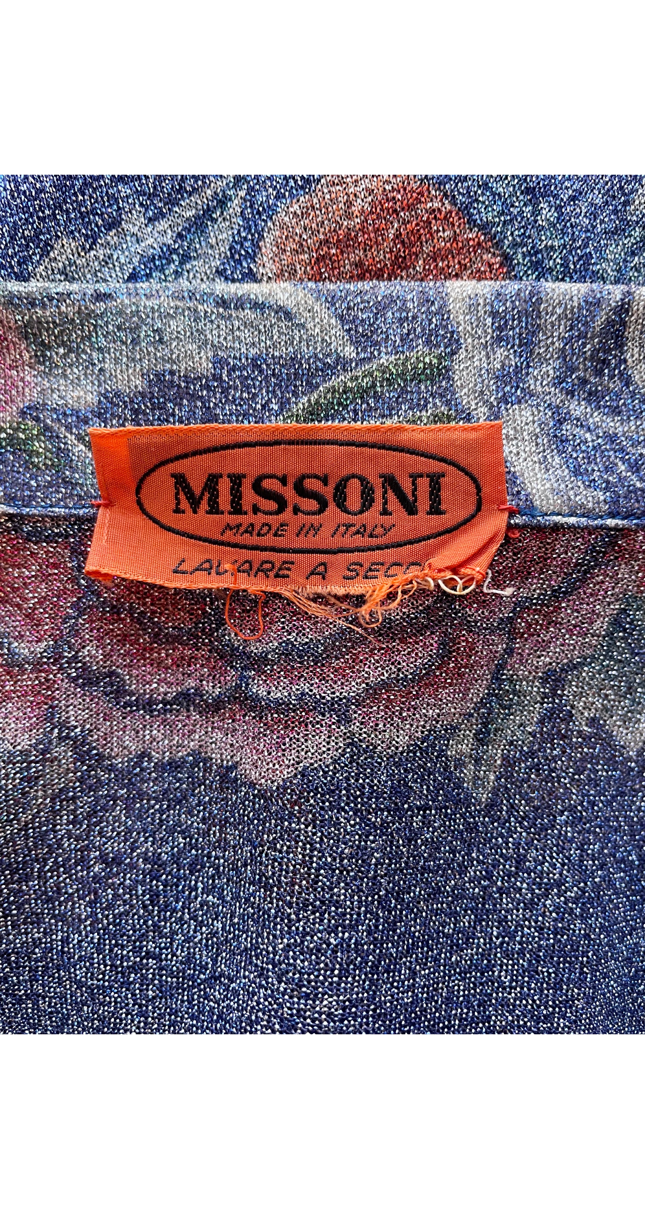 This 1972 Missoni collared top was made in Italy of semi-sheer blue lurex with a floral print. It fastens in the front with four clear plastic round buttons, and comes with the matching tie belt. The last photo shows the same fabric in dress form. The top is in excellent condition, clean and ready to wear.