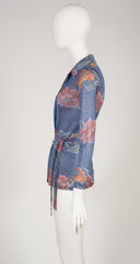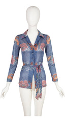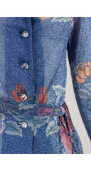 1972 Floral Blue Lurex Belted Button-Up Top