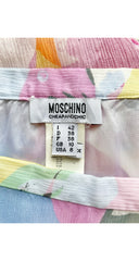 This Moschino handkerchief hem skirt was made in the 2000s for their "Cheap and Chic" line. The white pure silk chiffon features a fish novelty print throughout. The fabric is semi-sheer, even though the top is lined in rayon. The left side fastens with a concealed YKK zipper. It was made in Italy and remains in excellent condition. Professionally dry-cleaned and ready to wear.