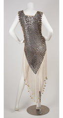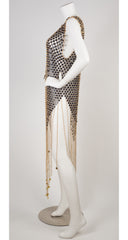 This 1970s chainmail evening dress is unsigned but the same design has been attributed to Paco Rabanne by prestigious auction houses. It's made from black quatrefoil plastic discs that are attached by gold aluminum rings, with gold-tone discs around the neckline, and 18" chains hanging from the hem with gold-tone discs attached. It slips over the wearer's head and is surprisingly lightweight.
