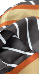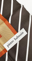 This 1970s Pierre Balmain scarf comes in its original box featuring the designer's iconic logo! It's pure silk with a brown, tan, orange, and white print and hand-rolled edges, measuring 31" x 30". It is in excellent condition, appearing to have never been used. There is one very minor imperfection to the silk (see the last photo) that is only noticeable on the back side.