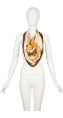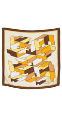 This 1960s Pierre Cardin scarf is made from Cream silk twill with a yellow and brown modular print. The edges are hand-rolled and the bottom right-hand corner is signed "Pierre Cardin". It measures 30” x 31”, and is in excellent condition.