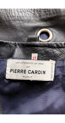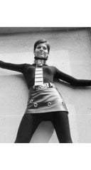 This super-iconic Pierre Cardin space age mini skirt dates to 1969. It was made in France from supple black lambskin leather with navy blue lining. Among its features are large silver metal grommets around the hem, four leather belt loops and an Acme zipper up the back. The label reads " Les Vetements de Peau de Pierre Cardin." It is in excellent condition with only some very minor patina to one of the back grommets.