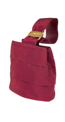 This 1990s Salvatore Ferragamo wristlet bag was made in Italy with a tiered burgundy grosgrain exterior and a burgundy leather lining and bottom. The 16" strap has a "Ferragamo"-signed buckle and the interior zip pocket has a gold-tone "Ferragamo"-signed zipper pull. The bag has the model number AU-214684 and measures 7" x 7" x 4.75". It closes with an interior clasp. Overall, it's in very good condition, appearing to have had very little wear. There is a faint black line along the top rim that's only noticeable under close inspection.