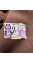 This late-1960s/early-1970s Shubette of London maxi dress was made in England of brown acetate crepe. It has a low neckline with a built in gold metallic choker adorned with brown cabochons and gold-tone metal chains. Other features include short puff sleeves with an inverted pleat on each sleeve. The dress fastens in the back with a metal zipper. It's in excellent condition, has been professionally dry-cleaned and is ready to wear.