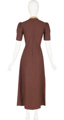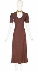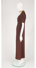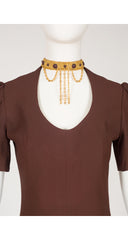 1970s Gold Chain Choker Brown Crepe Maxi Dress