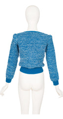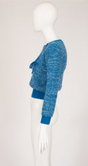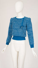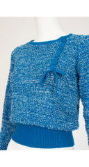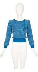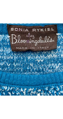 This early-1970s Sonia Rykiel pullover sweater was made in Italy of blue and white wool knit, and originally sold at Bloomingdale's. It has puff shoulders, a ribbed trim and four buttons down the left side of the neck with a decorative bow. It's in very good condition, clean and ready to wear.