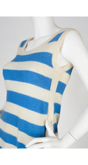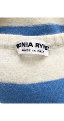 This S/S 1976 Sonia Rykiel sleeveless tunic dress was featured on that season's runway. It was made in Italy of an unlined 80% wool/20% angora knit with cream & blue stripes. It features a 25" slit up each side with one button at the top, and is meant to be worn with pants or a long skirt.