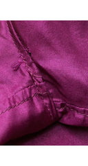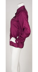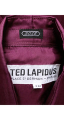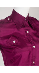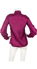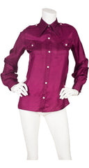 This 1970s pointed collar Ted Lapidus button-up shirt was made in France of a magenta tissue silk. It does up the front with six shell buttons, and has an additional button on each cuff and each epaulette. It has two breast pockets.