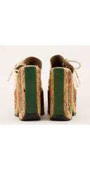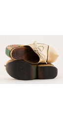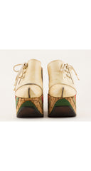 These 1970s Tony Iammatteo for Cristina clogs have 5" platforms made from cork with a red and green hand-drawn design and cream patent leather lace-up uppers. The size isn't labeled but they fit like a 5 1\2 US.