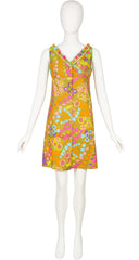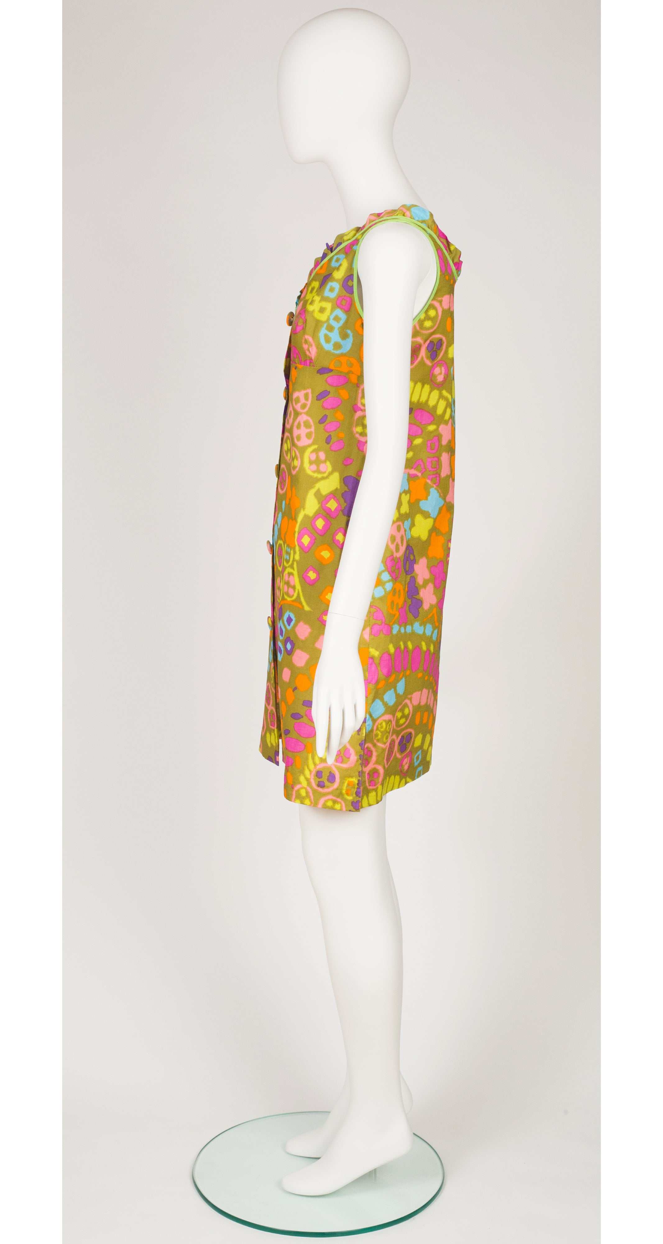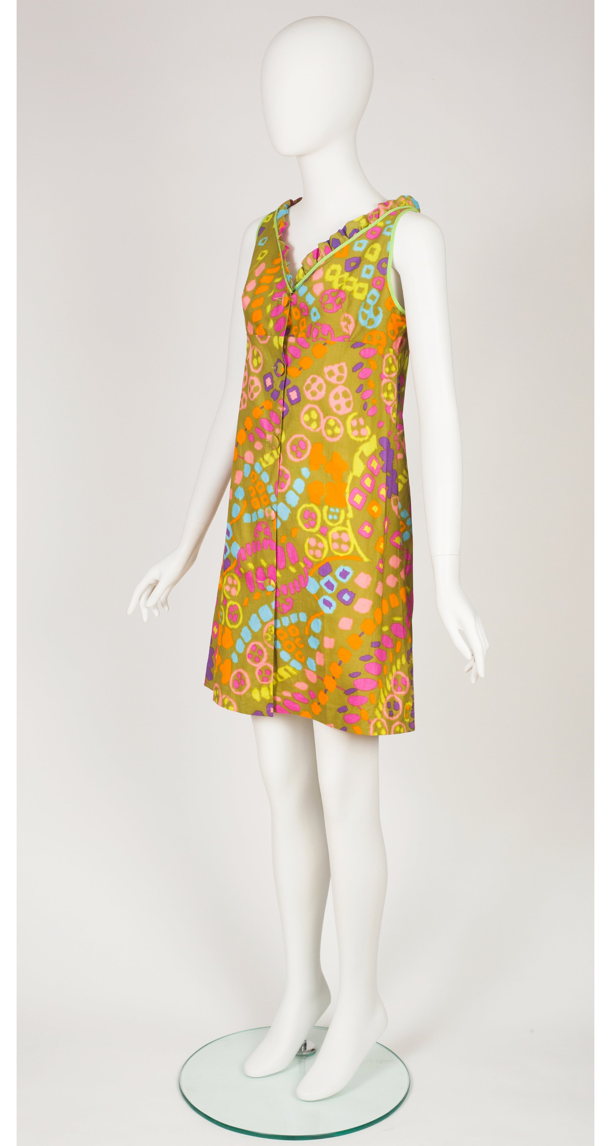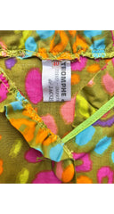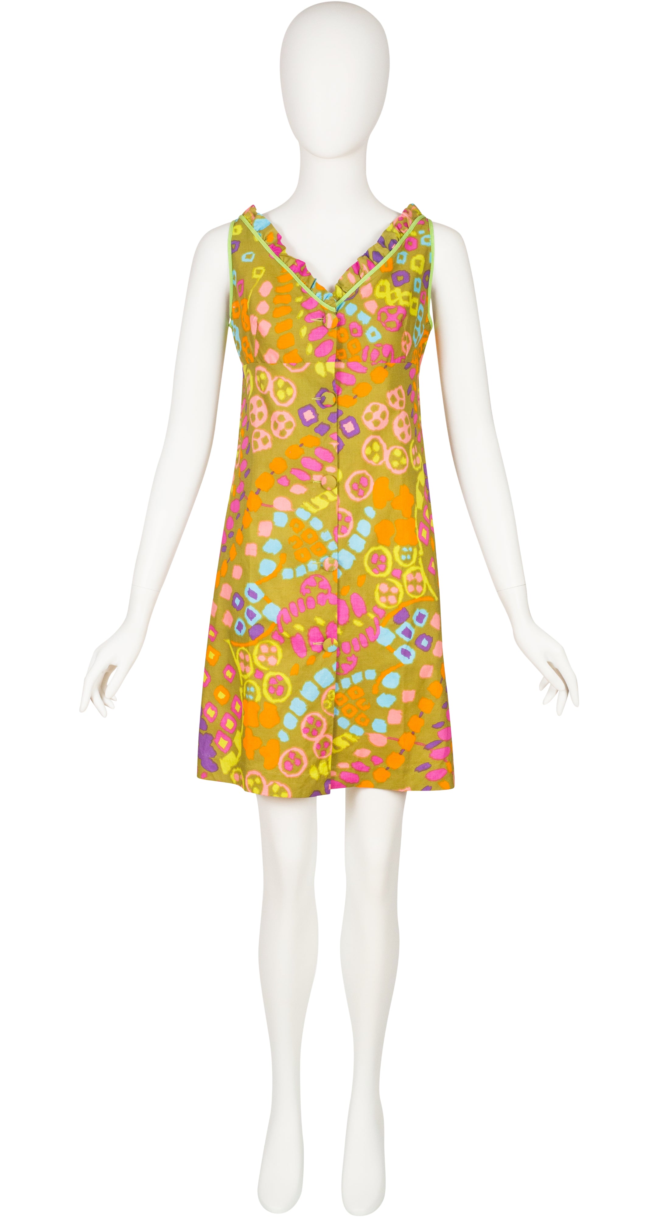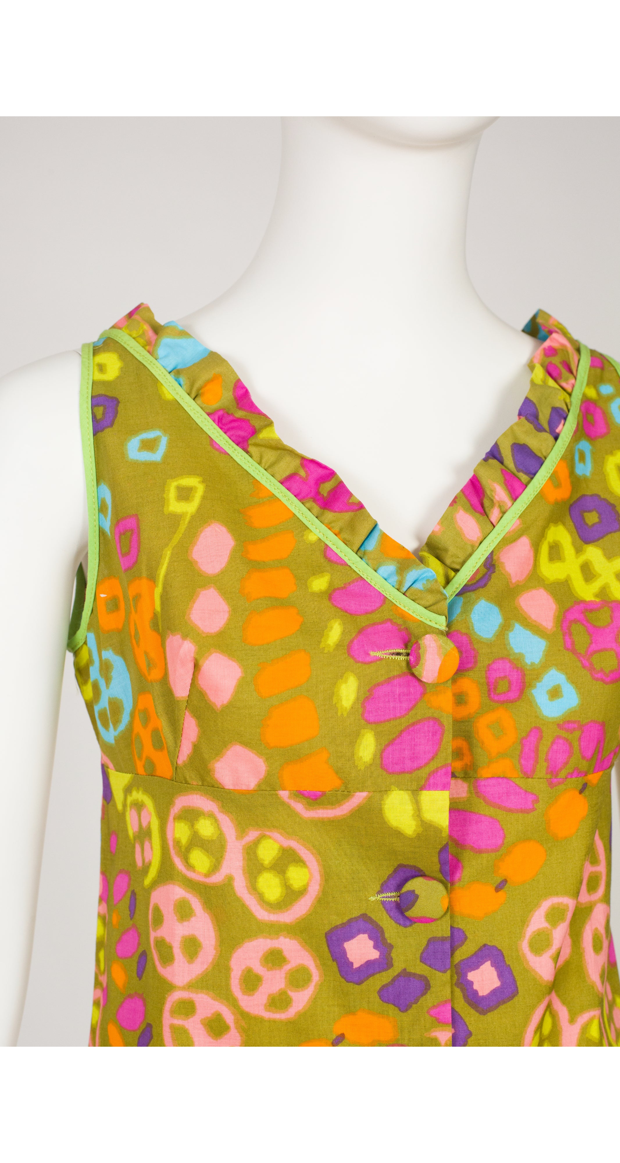 This 1960s sleeveless beach dress was made with a Triomphe de Boussac pattern. It uses Jacques Heim's "Imprimé Vacances" fabric, an unlined cotton with a multicolour abstract print and lime green trim. It features a ruffle neckline and empire waist. Five buttons fasten the front. It's in excellent condition, clean and ready to wear.