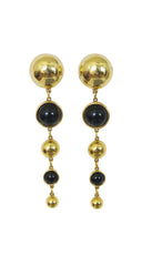 What a find! Courrèges is famous for his “space age” designs, and though these gold-tone and black clip-on earrings most likely date to the 70’s-80’s, the drop style is quintessential to the designer’s golden era, the 1960’s. They are 9 cm long, with the largest ball having a 2 cm diameter. In great condition, and signed.
