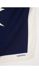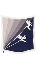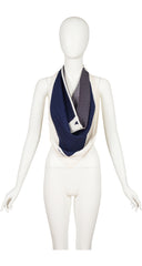 This late-1970s Valentino scarf was manufactured by Stratos in Italy from polka dot cream silk jacquard. The navy and grey gradient design has a silhouette of a Bird of Paradise. It has hand-rolled edges and measures 34" x 34". It's in excellent condition.