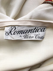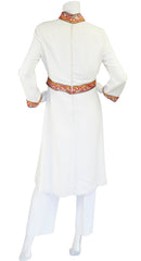 This 1960s Victor Costa Romantica two-piece set is designed with a Middle Eastern influence, a look that was very fashionable in the late-1960s. The set consists of a tunic with a 24" slit down the front and a pair of high-waisted trousers, both made from white crêpe. The tunic is trimmed in metallic paisley ribbon, has 9 gold buttons down the front, and does up the back with a Talon zipper. The trousers have a pleat down each leg, zip up the front, and have an elastic waistband. Please note that only the tunic is labeled, which was common in this era. It is in very good condition, professionally dry-cleaned, and ready to wear.