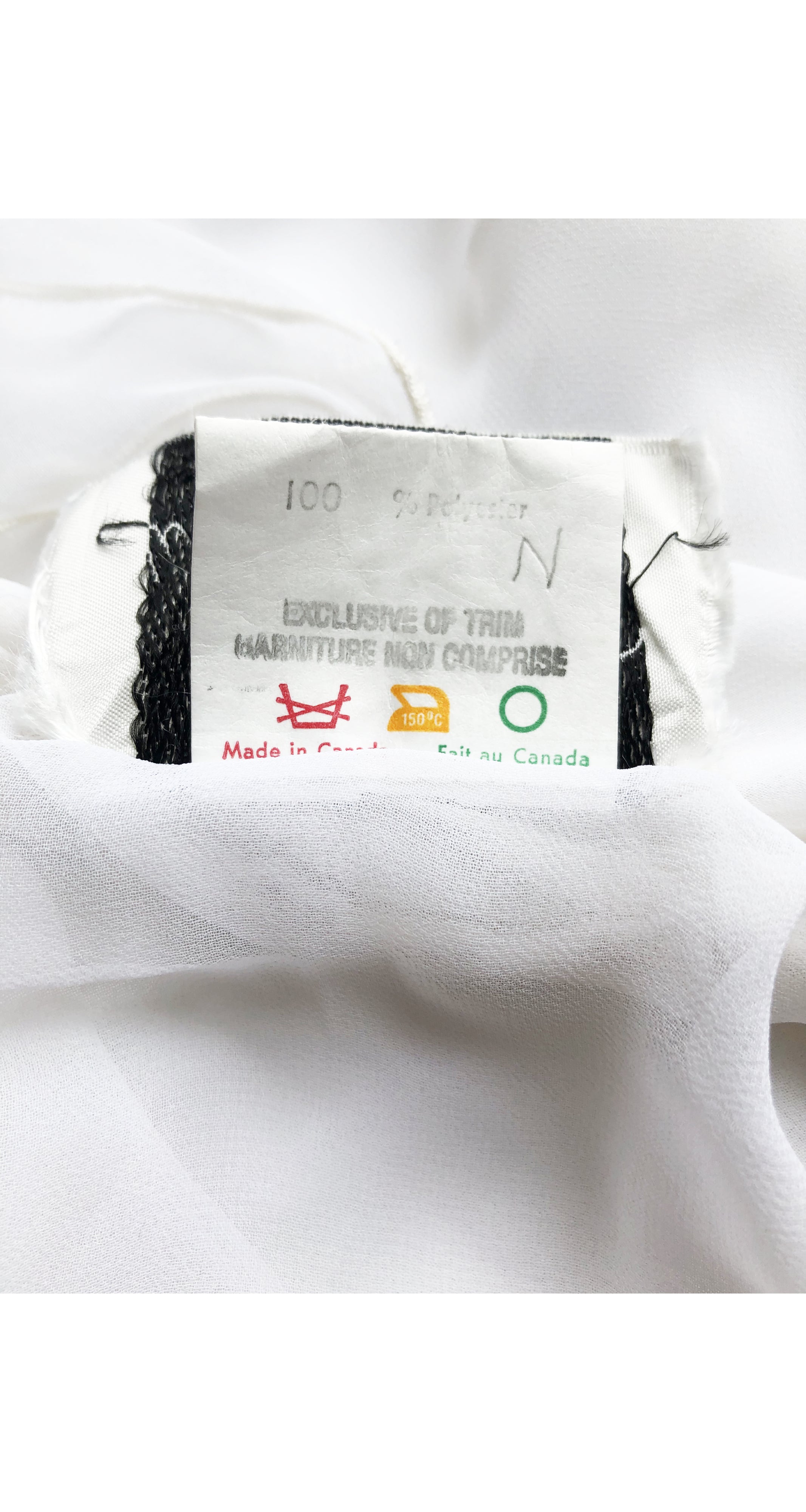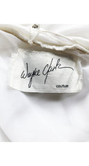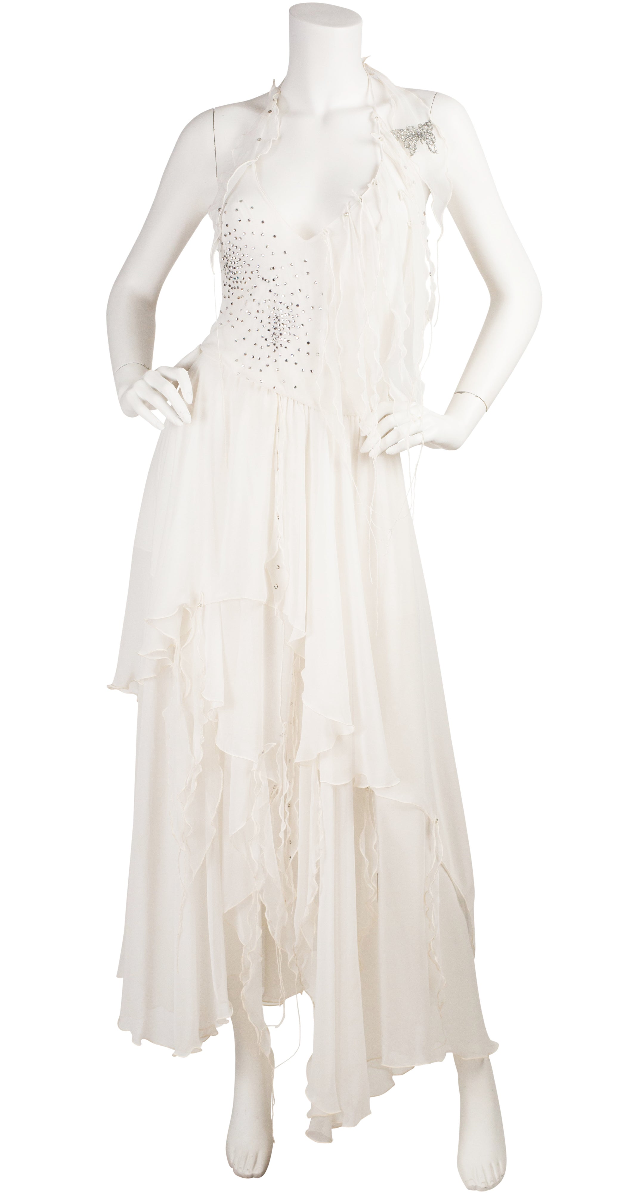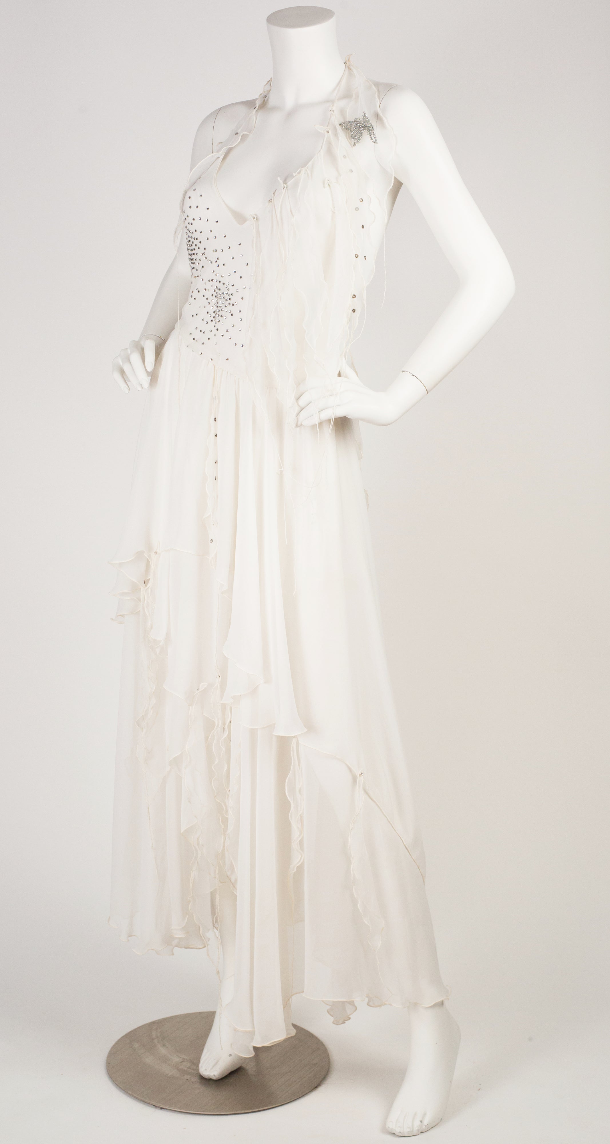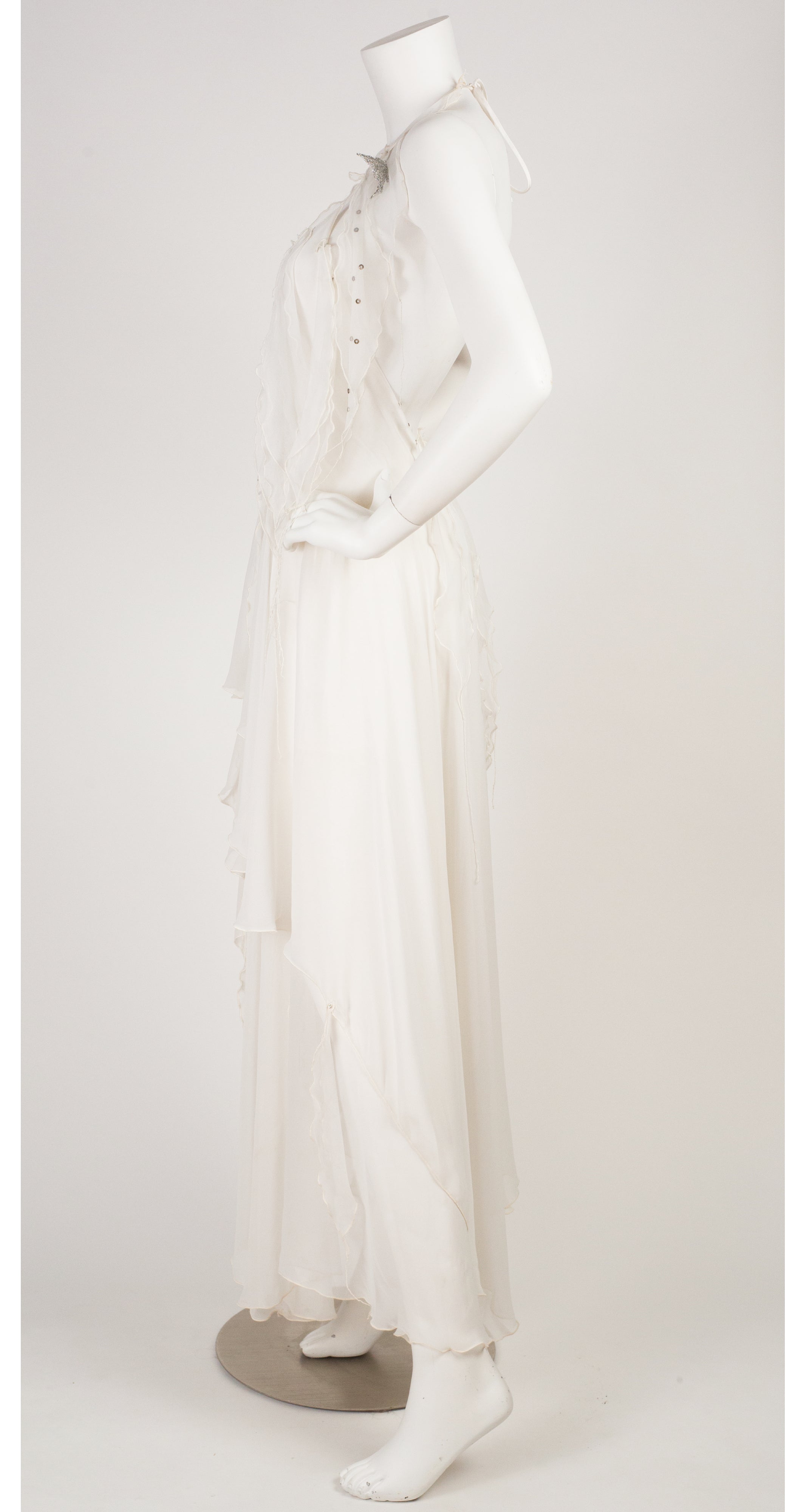 This incredible Wayne Clark Couture dress dates to the late-1970s. It was made in Canada from flowy white polyester chiffon with a very similar feel to silk, and lined in chiffon. It is semi-sheer (the tag is visible in the back), with a low back, halter neck and elastic waistband. It features rhinestones on the bust and chiffon "leaves" attached with rhinestones throughout. One of the leaves on the halter neck tie has a silver metallic butterfly attached. It would make a truly show-stopping wedding dress!