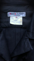 This Yves Saint Laurent jacket is from the designer's iconic "Rive Gauche" ready-to-wear line. Made in France of durable black cotton, it does up the front with 4 black plastic buttons and has two large pockets. It is labeled a size 38, but the oversized shape and balloon sleeves allow for a generous fit. It is in excellent condition (possibly unworn,) professionally dry-cleaned, and ready to wear.