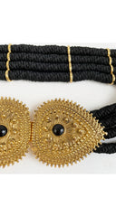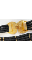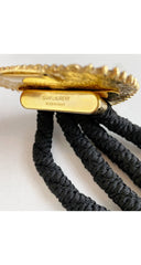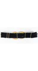 This Yves Saint Laurent 1981-82 F/W belt was featured on that season's runway. It's composed of four black elasticized cords with a large ornate gold-plated metal buckle. It fastens with a hook and is signed "SAINT LAURENT - W. GERMANY." It fits a 23"-36" waist, and the buckle measures 5.75" x 2 5/8". It's in excellent condition.