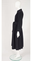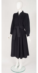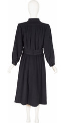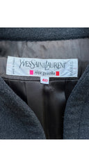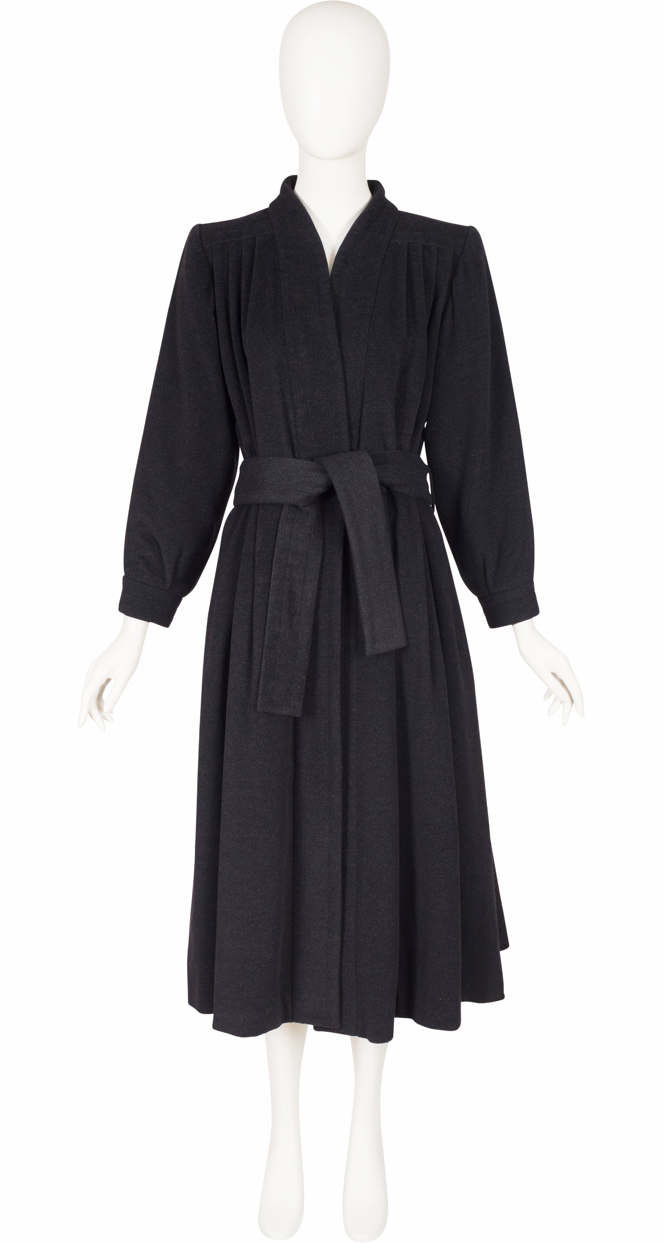 This 1995-96 F/W Yves Saint Laurent Rive Gauche pleated coat was worn by Carla Bruni on that season's runway. It was made in France of charcoal gray wool with black rayon satin lining. It features voluminous sleeves with a button on each cuff, and pocket on each side. It fastens with a button at the waist. The original 2 5/8" wide tie belt is included. It's in excellent condition, has been professionally dry-cleaned, and is ready to wear.